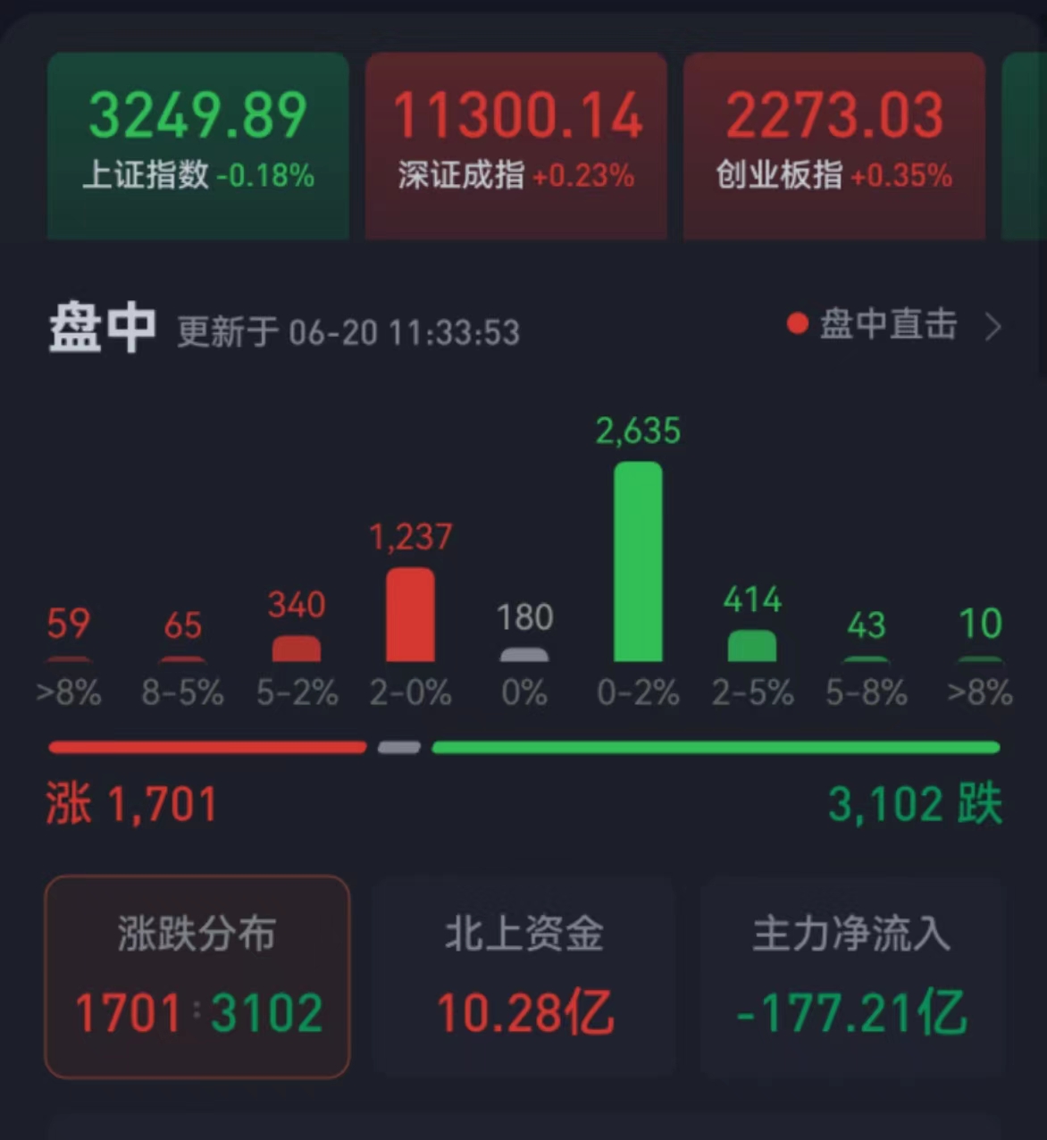 周二(6月20日),三大股指震蕩分化。截至上午收盤,上證指數跌0.18%,報3249.89點;深證成指和創業板指分別漲0.23%和0.35%;滬深兩市合計成交額6707.7億元,總體來看,兩市個股跌多漲少。