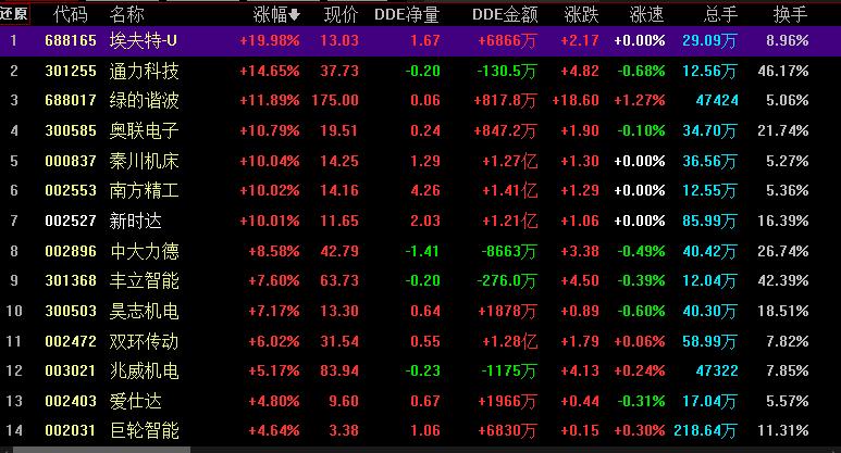 具體看,截至6月20日上午收盤,減速器板塊漲幅居首,達4.30%,資金凈流入達73.30億元。其中,埃夫特-U、通力科技、綠的諧波、奧聯電子、秦川機床、南方精工、新時達等概念股漲幅均超10%。