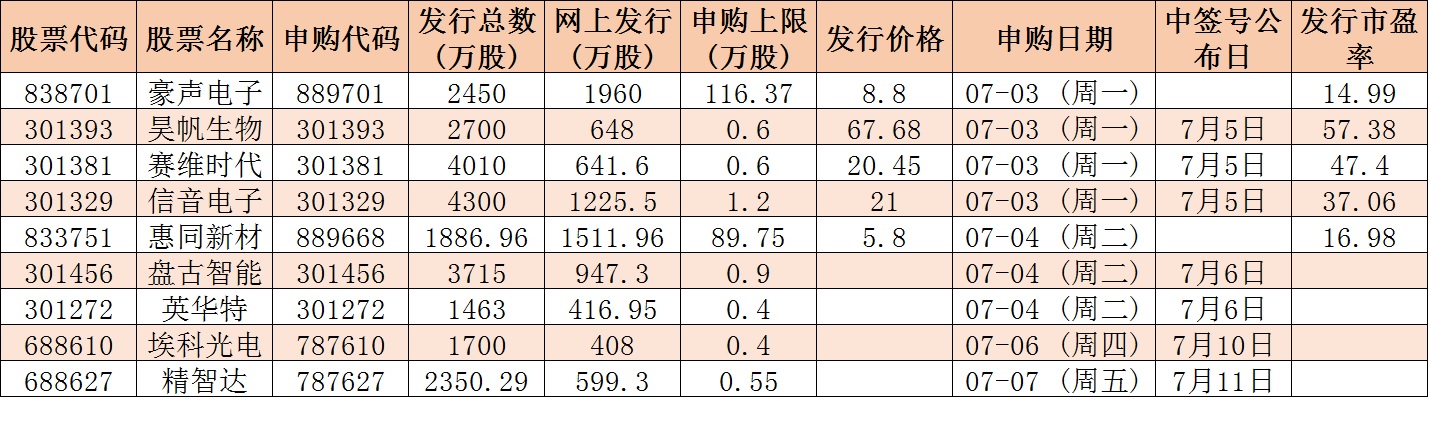 根據發行安排,下周(7月3日-7月7日)A股市場共9只新股發行,其中創業板5只,科創板2只,北交所2只。