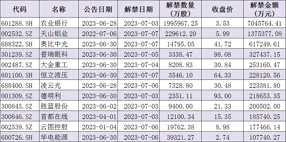 與此同時,據同花順統計顯示,下周(7月3日-7日)共有88家公司限售股陸續解禁,按最新收盤價計算,解禁市值為1226.34億元。從解禁市值來看,農業銀行(704.58億元)、天山鋁業(137.54億元)等公司解禁金額超100億元。