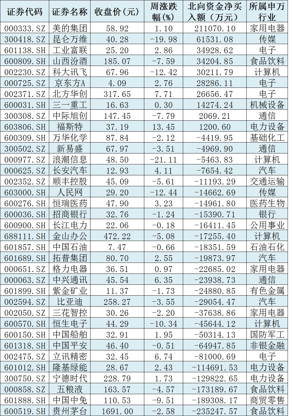 資金方面,本周北向資金累計凈賣出金額達84.81億元。從前十大成交活躍股來看,本周,美的集團、昆侖萬維等2只個股,北向資金凈買入金額均超6億元。另外,貴州茅臺、中國中免、五糧液、寧德時代、隆基綠能等個股遭北向資金凈賣出金額均超10億元。
