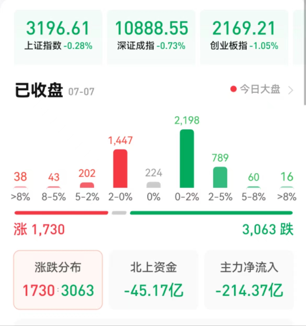 周五(7月7日),A股三大股指震蕩下行。截至收盤(pán),上證指數(shù)跌0.28%報(bào)3196.61點(diǎn),深成指跌0.73%報(bào)10888.55點(diǎn),創(chuàng)業(yè)板指跌1.05%報(bào)2169.21點(diǎn);兩市合計(jì)成交金額達(dá)7998億元,北向資金凈賣(mài)出45.17億元。總體上看,兩市個(gè)股跌多漲少,下跌個(gè)股超3000只,其中,漲停個(gè)股達(dá)27只,跌停個(gè)股達(dá)9只。