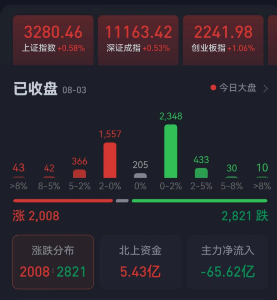 周四(8月3日),A股三大股指震蕩上行,全線飄紅。截至收盤,上證指數(shù)漲0.58%報(bào)3280.46點(diǎn),深證成指漲0.53%報(bào)11163.42點(diǎn),創(chuàng)業(yè)板指漲1.06%報(bào)2241.98點(diǎn);兩市合計(jì)成交8328.76億元,北向資金凈買入5.43億元。總體上看,兩市個(gè)股跌多漲少。其中,漲停個(gè)股達(dá)27只,跌停個(gè)股達(dá)6只。