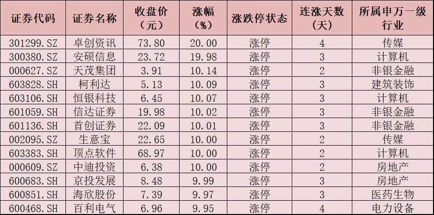表:連續(xù)上漲2日且今日收盤漲停個股情況:
