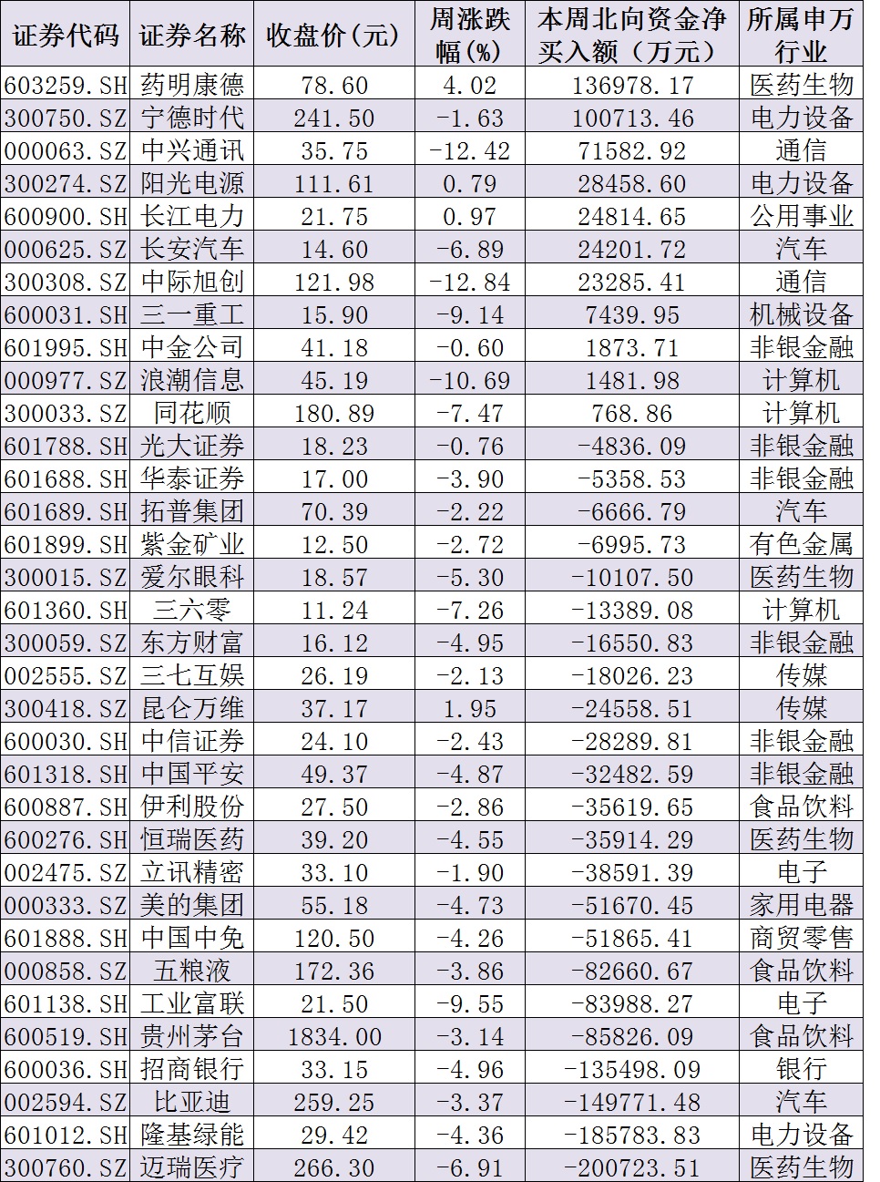 資金方面,本周北向資金累計凈賣出金額達255.8億元。從前十大成交活躍股來看,本周,藥明康德、寧德時代等2只個股,北向資金凈買入金額均超10億元。另外,邁瑞醫療、隆基綠能、比亞迪、招商銀行等個股遭北向資金凈賣出金額均超10億元。