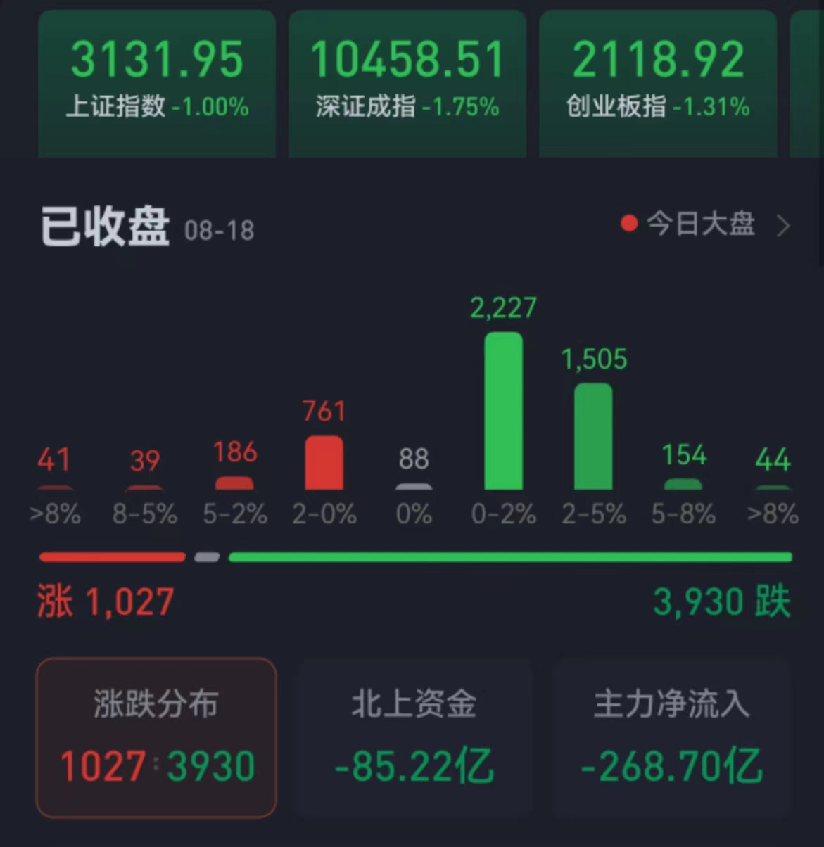 周五(8月18日),A股三大股指震蕩回落。截至收盤,上證指數(shù)跌1%,報3131.95點(diǎn);深證成指跌1.75%,報10458.51點(diǎn),再創(chuàng)年內(nèi)新低;創(chuàng)業(yè)板指跌1.31%,報2118.92點(diǎn);兩市合計成交金額7446.74億元。北向資金凈賣出85.22億元,連續(xù)10日減倉累計近550億元;總體來看,整個市場的個股跌多漲少,其中,漲停個股達(dá)37只,跌停個股達(dá)9只。