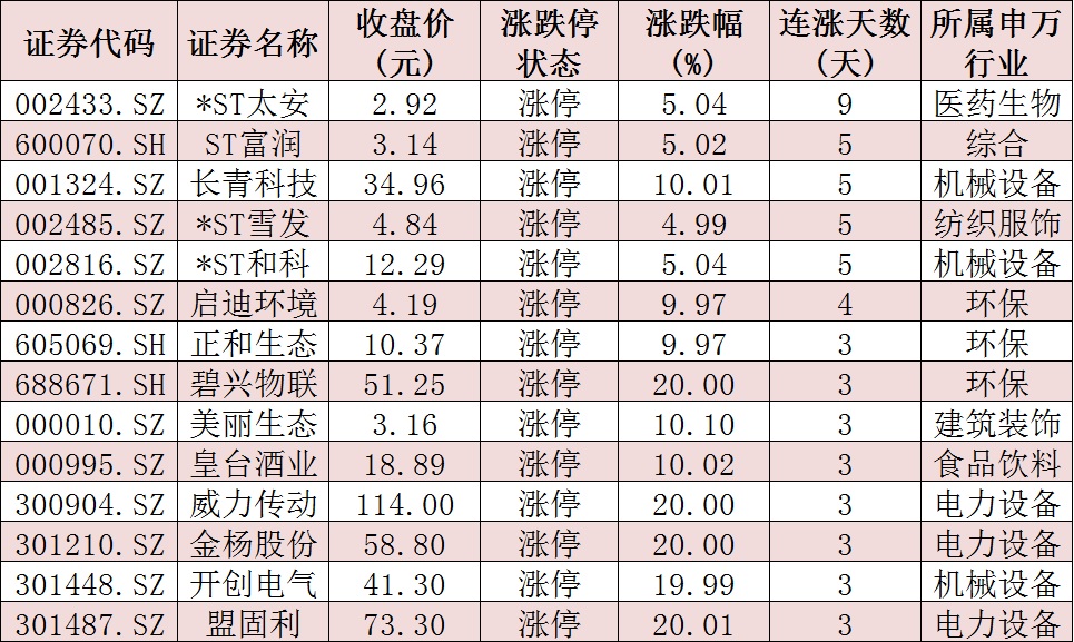 表:連續(xù)上漲3日且今日收盤漲停個股情況: