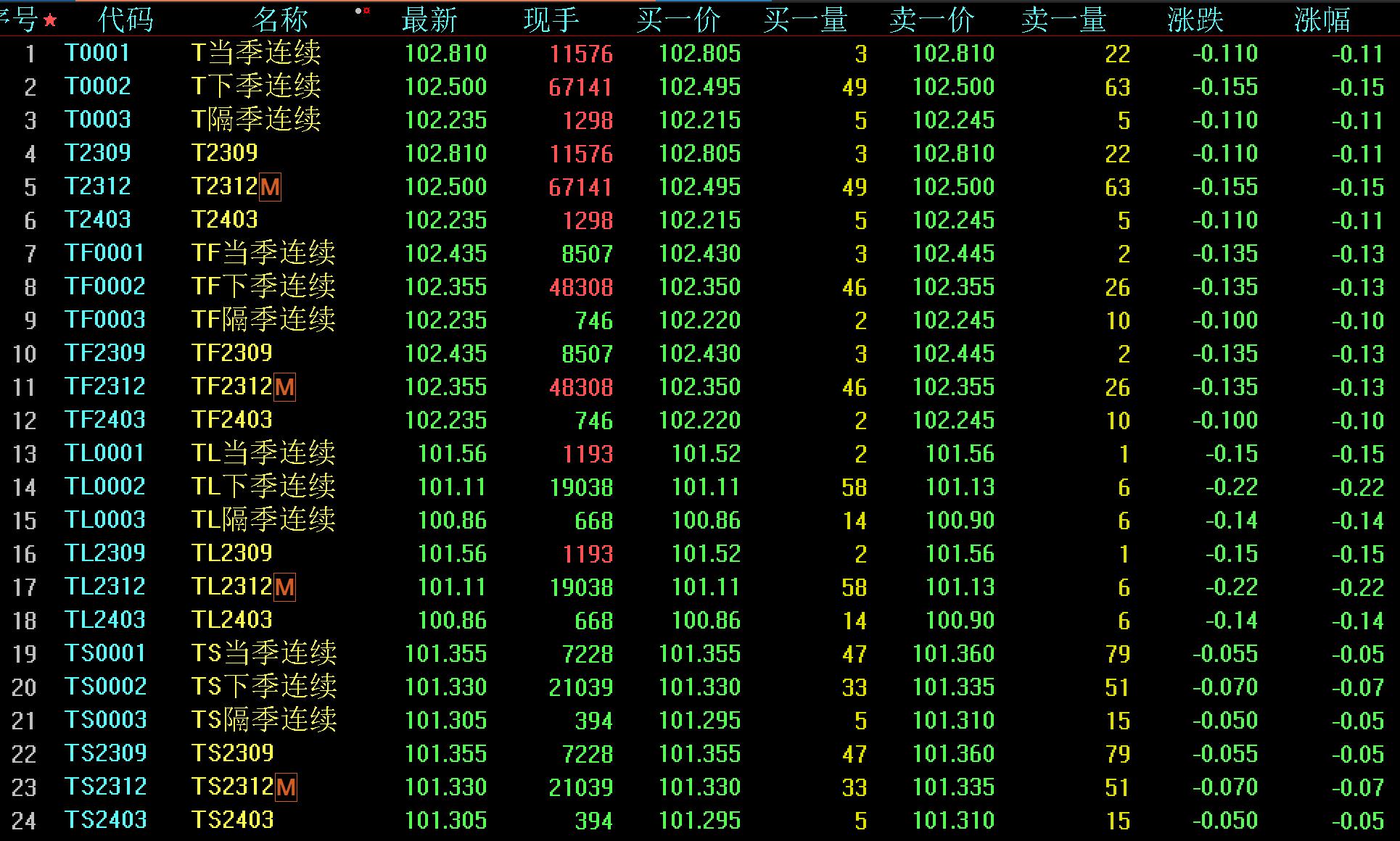 周五,銀行間主要利率債收益率普遍上行,中短券表現更弱。國債期貨全線收跌,10年期國債期貨主力合約收跌0.15%。截至收盤,30年期國債期貨報收101.110元,下跌0.220元,跌幅0.22%;10年期國債期貨報收102.500元,下跌0.155元,跌幅0.15%;5年期國債期貨報收102.355元,下跌0.135元,跌幅0.13%;2年期國債期貨報收101.330元,下跌0.070元,跌幅0.07%。