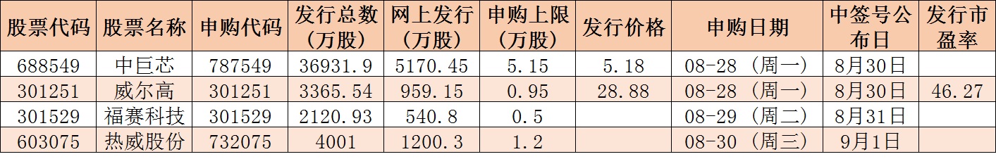 根據發行安排,下周(8月28日—9月1日)有4只新股發行,其中滬市主板1只,創業板2只,科創板1只。具體安排如下,周一2只:中巨芯(科創板)、威爾高(創業板);周二1只,福賽科技(創業板),周三1只:熱威股份,上述公司股票的申購將在下周陸續開放。