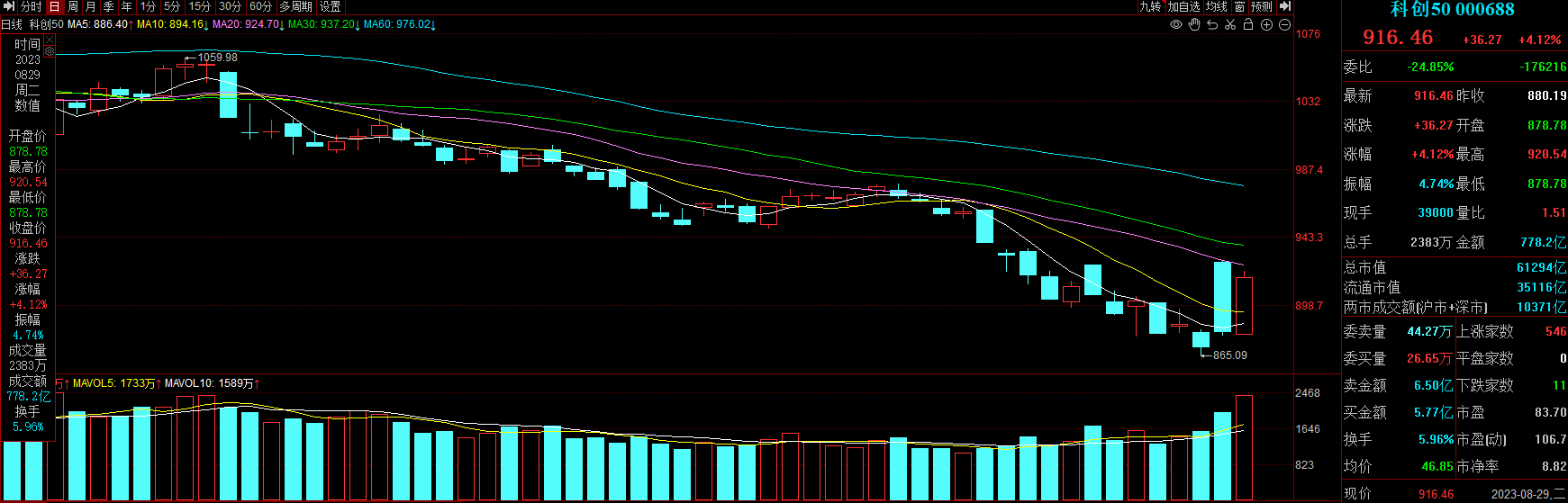 8月29日(周二),A股三大指數(shù)低開高走,上證指數(shù)收復(fù)3100點(diǎn)關(guān)口,科創(chuàng)50指數(shù)表現(xiàn)最強(qiáng)。截至收盤,上證指數(shù)漲1.2%,報(bào)3135.89點(diǎn);深證成指漲2.17%,創(chuàng)業(yè)板指漲2.82%,科創(chuàng)50指數(shù)漲4.12%。滬深兩市合計(jì)成交額10371.05億元,連續(xù)第二個(gè)交易日突破1萬億元;北向資金凈賣出6.80億元。總體來看,A股個(gè)股漲多跌少,超4700只個(gè)股實(shí)現(xiàn)上漲,其中,漲停個(gè)股達(dá)82只,跌停個(gè)股有1只。