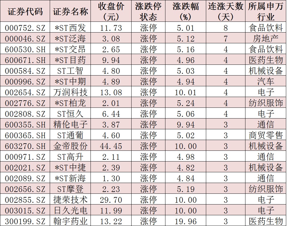 表:連續(xù)上漲3日且今日收盤(pán)漲停個(gè)股情況