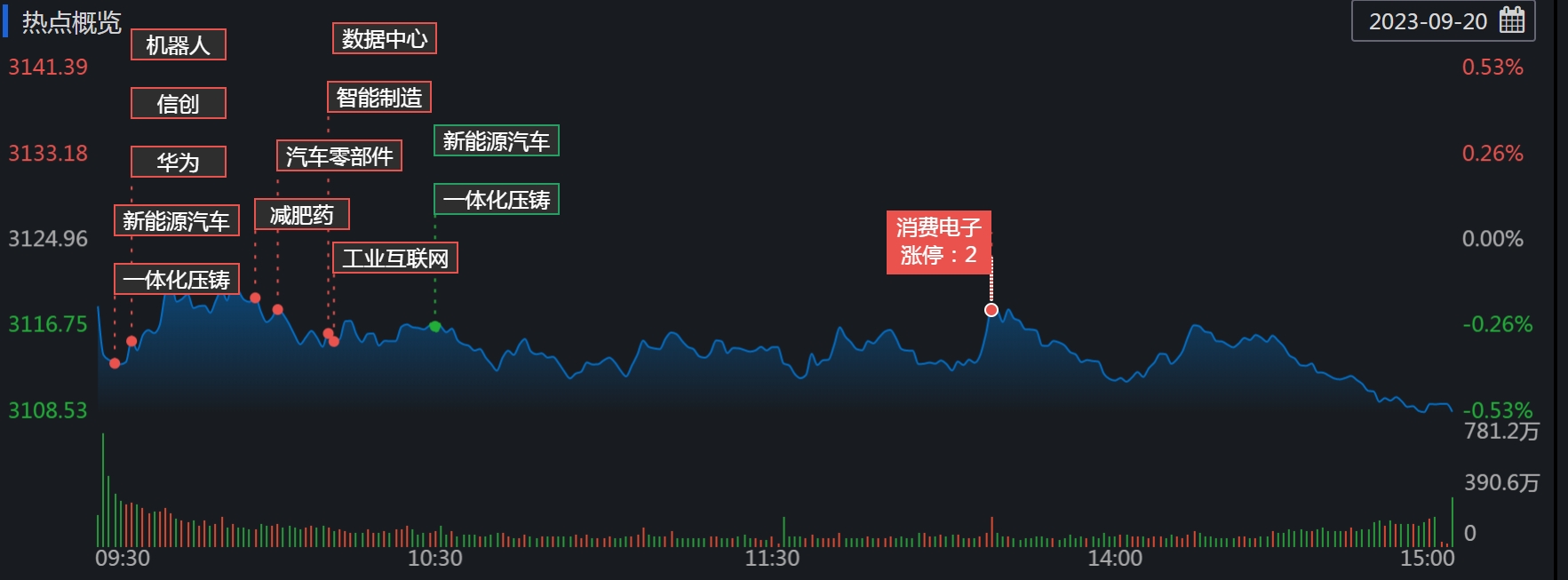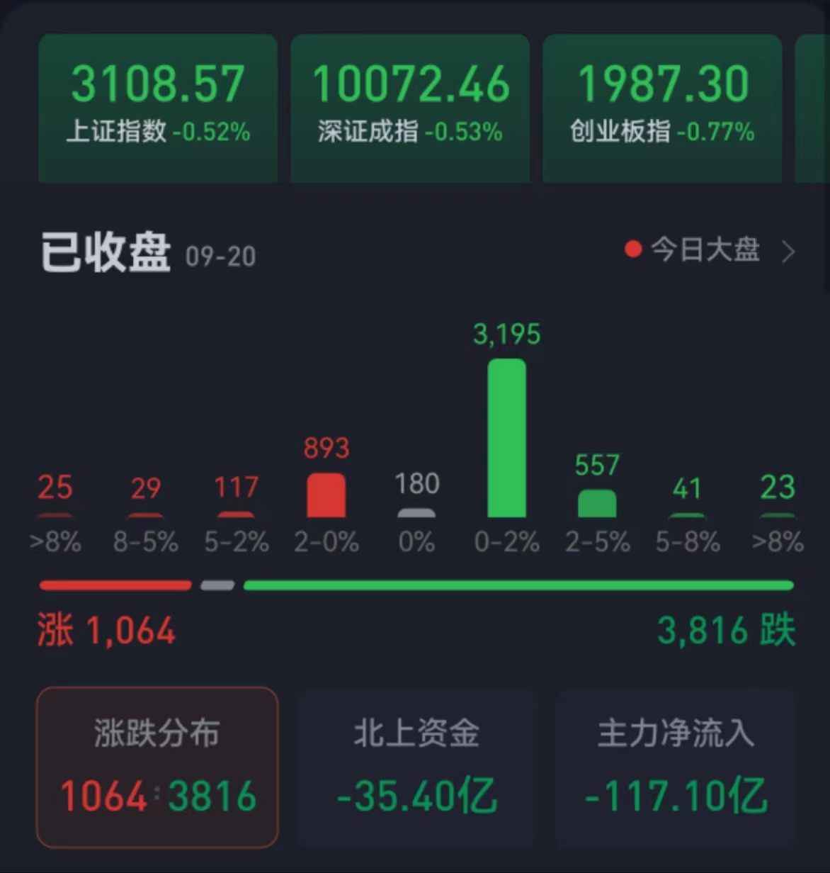 周三(9月20日),A股三大股指繼續(xù)震蕩回落。截至收盤(pán),上證指跌0.52%報(bào)3108.57點(diǎn),深證成指跌0.53%報(bào)10072.46點(diǎn),創(chuàng)業(yè)板指跌0.77%報(bào)1987.3點(diǎn),兩市合計(jì)成交金額5732.63億元,北向資金凈賣(mài)出35.4億元。總體上看,A股個(gè)股跌多漲少,下跌個(gè)股超3800只。其中,漲停個(gè)股達(dá)38只,跌停個(gè)股達(dá)13只。