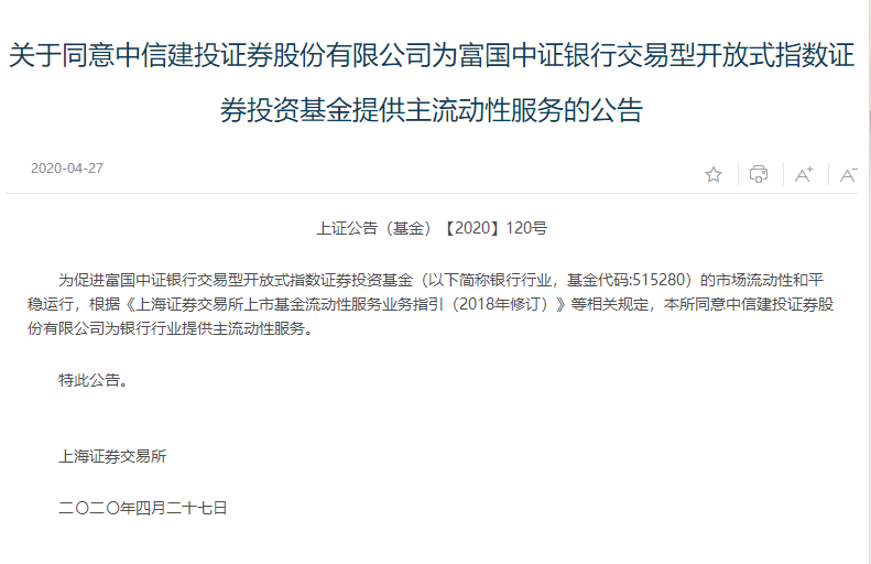 上交所4月27日公告,同意中信建投證券股份有限公司為富國中證銀行交易型開放式指數(shù)證券投資基金(簡稱:銀行行業(yè),基金代碼:515280)提供主流動(dòng)性服務(wù)。