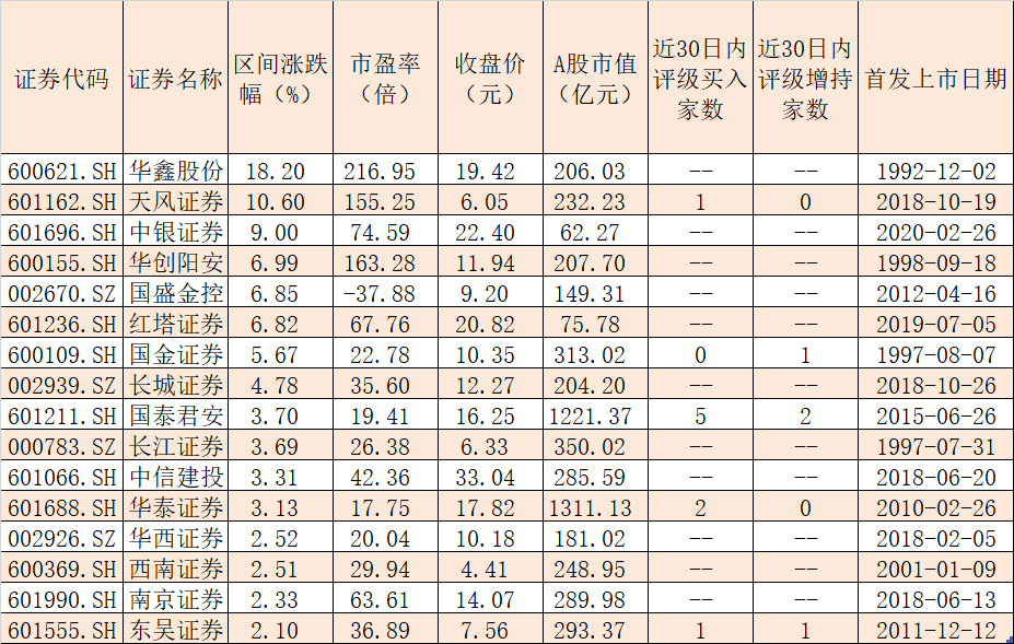 個股方面,華鑫股份、天風證券、中銀證券、華創陽安、國盛金控、紅塔證券、國金證券等7只個股月內累計漲幅逾5%。