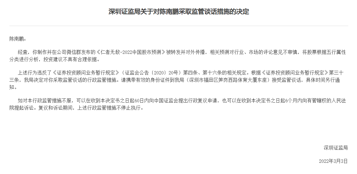 深圳證監局表示,經查,陳南鵬制作并在公司微信群發布的《仁者無敵-2022中國股市預測》被轉發并對外傳播,相關預測對行業、市場的評論意見不審慎,將股票根據五行屬性分類進行分析,投資建議不具有合理依據,違反《證券投資顧問業務暫行規定》相關規定。深圳證監局對陳南鵬采取監管談話的行政監管措施。