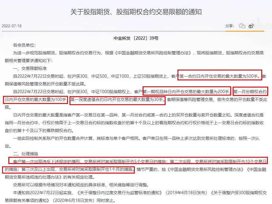 自2022年7月22日交易時起,在滬深300、中證500、中證1000、上證50股指期貨上,客戶某一合約日內開倉交易的最大數量為500手。套期保值等風險管理交易的開倉數量不受此限。