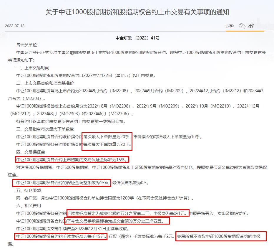 7月18日,證監會網站消息顯示,證監會近日批準中國金融期貨交易所開展中證1000股指期貨和期權交易。相關合約正式掛牌交易時間為2022年7月22日。當日,中金所發布關于中證1000股指期貨和股指期權合約及相關業務規則的通知等系列規則。