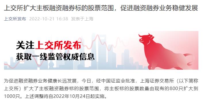 其中,滬市主板標的股票數量由現有的800只擴大到1000只,深市注冊制股票以外的標的股票數量由現有的800只擴大到1200只,上述調整將自2022年10月24日起實施。