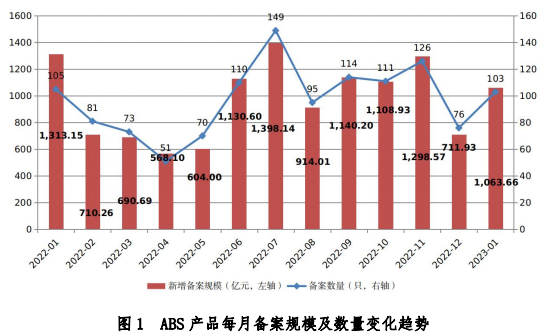 2月22日,中基協發布2023年1月份《企業資產證券化業務備案運行情況簡報》顯示,2023年1月份,企業資產證券化產品共備案確認103只,新增備案規模合計1063.66億元。1月份新增備案規模環比增長49.41%,同比減少19.00%。