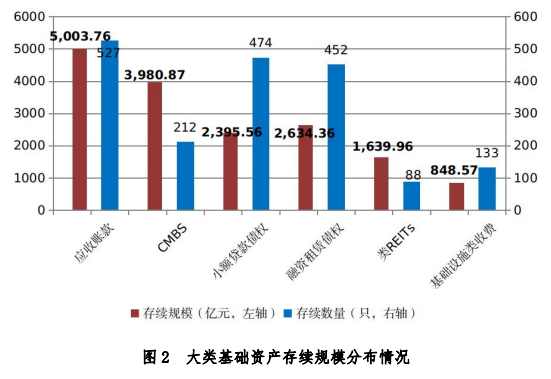 截至2023年1月底,存續企業資產證券化產品2206只,存續規模19540.34億元,存續規模較上月增長0.31%。按基礎資產二級分類來看,應收賬款、商業不動產抵押貸款(CMBS)、小額貸款債權、融資租賃債權、類REITs以及基礎設施類收費存續規模合計16503.08億元,占總存續規模的84.46%?;A設施公募REITs、保障房、購房尾款等其他類別基礎資產存續規模合計3037.26億元,占總存續規模的15.54%。