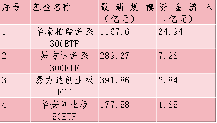 其中,華泰柏瑞滬深300ETF當日增加9.87億份,至329.77億份,資金凈流入達34.94億元。易方達滬深300ETF當日增加4.30億份,至171.08億份,資金凈流入達7.28億元。此外,易方達創業板ETF、富國上證指數ETF單日“吸金”均超2億元。