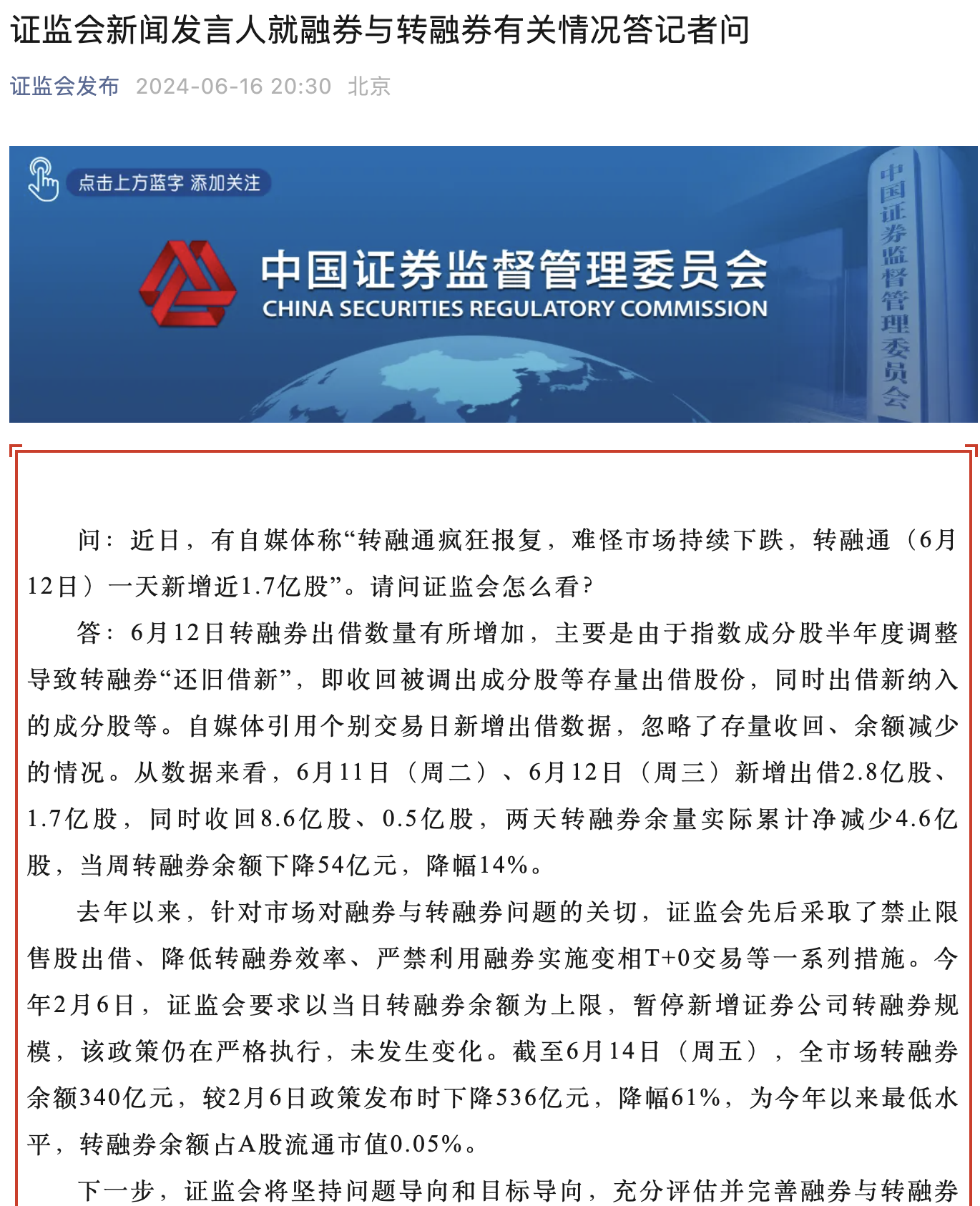 對此,6月16日,證監會新聞發言人答記者問時表示,6月12日轉融券出借數量有所增加,主要是由于指數成分股半年度調整導致轉融券“還舊借新”,即收回被調出成分股等存量出借股份,同時出借新納入的成分股等。