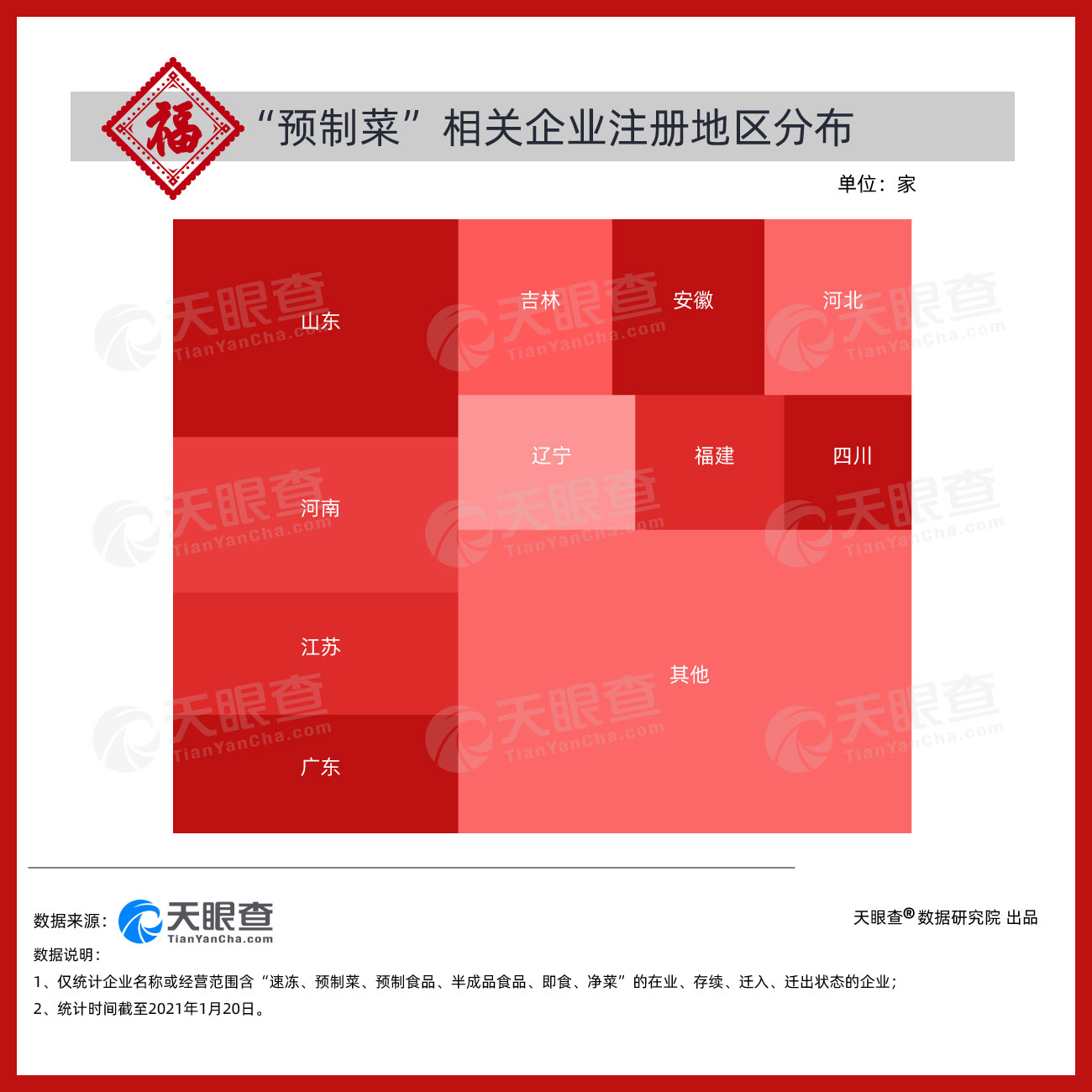 據天眼查大數據顯示,“預制菜”相關企業在近兩年快速崛起。通過界定企業名稱或經營范圍包含“速凍、預制菜、預制食品、半成品食品、即食、凈菜”的企業發現,截止目前,我國共有超過6.9萬家相關企業。從地域分布來看,山東省的相關企業數量最多,超9400家,占全國的13.71%。河南、江蘇、廣東均擁有超過5000家相關企業,分別位列全國第二、三、四位。