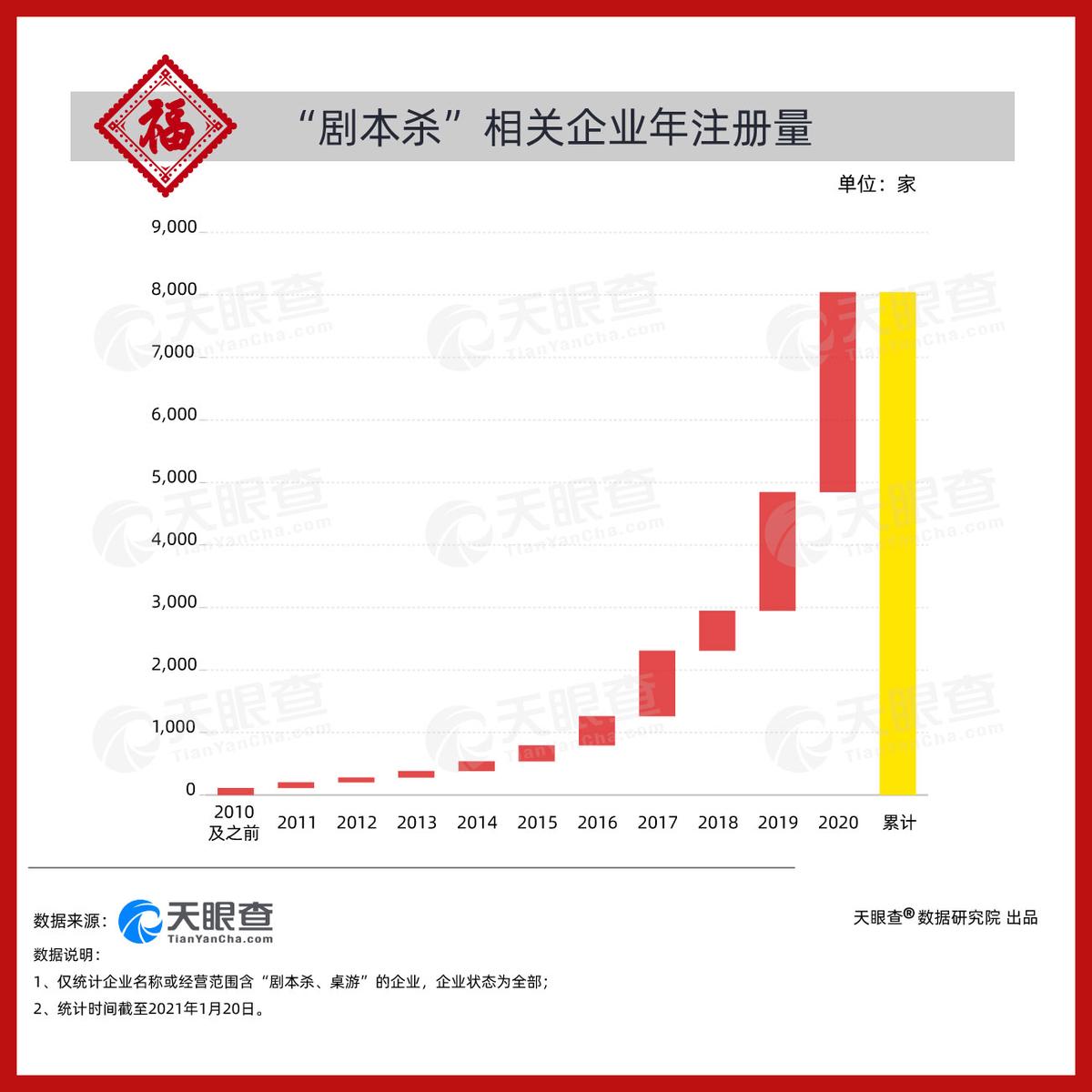 就地過年,想和朋友聚會怎么辦?不妨線上開語音開視頻玩劇本殺,這也是當下很受年輕人喜歡的娛樂活動。據天眼查大數據顯示,從事劇本殺相關企業近年來的發展表現迅猛,有超過6,500家。2020年共新增劇本殺相關企業超過3,100家,較2019年同比增長63%。目前知名的線上劇本殺平臺、劇本殺游戲社交平臺有我是謎、天天劇本殺、推理大師、百變大偵探、天天狼人殺等。