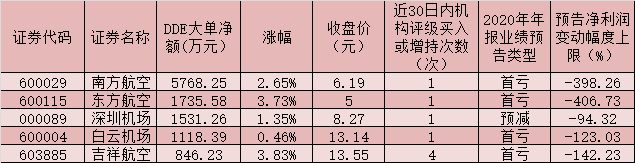 表:3月9日實現大單資金凈流入的航空股一覽