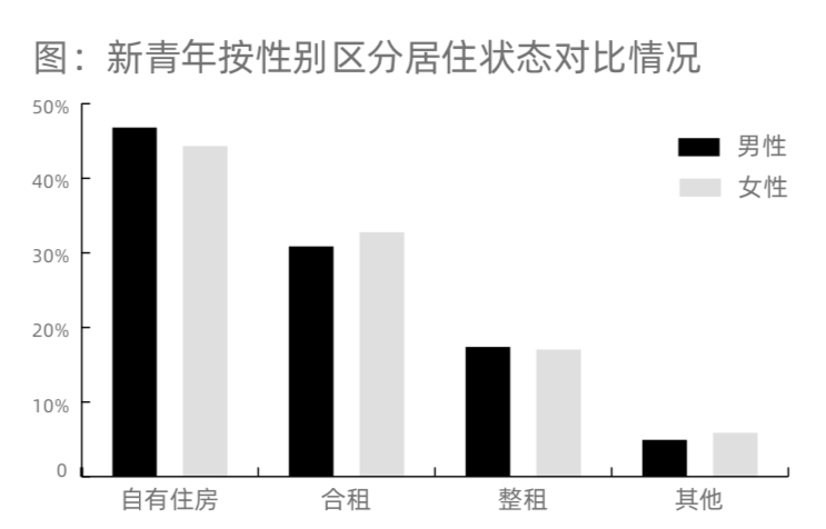 報告顯示,租房仍是新青年的主流,約49.2%的受訪者目前正租房居住,約45.3%受訪者的居住狀態是自有住房。無論男性還是女性,合租均是主流的租賃方式,但男性受訪者自有住房的占比相對更高。
