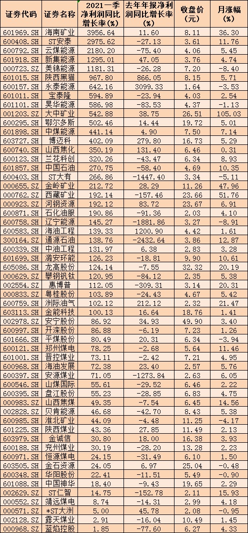 從個股方面來看,采掘行業中,有56家公司一季報凈利潤同比實現增長,占行業內成份股的83.58%。其中,海南礦業、ST安泰、云煤能源、新集能源、美錦能源等5只個股,凈利潤同比增幅均超10倍,分別為3956.64%、2975.62%、2180.2%、1295.01%、1181.3%。