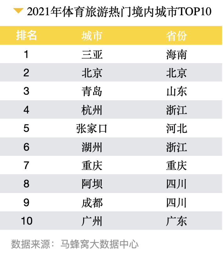 在2021年體育旅游熱門境內(nèi)城市Top10榜單上,因疫情導(dǎo)致的境外游受限,卻讓以往熱衷境外體育游人群紛紛將目光轉(zhuǎn)向境內(nèi)目的地,潛水、沖浪、浮潛、滑翔傘等曾經(jīng)的境外海島游熱門玩法,使三亞迅速躥升至境內(nèi)體育旅游熱門目的地Top1。北京憑借2022年冬奧會(huì)舉辦地的優(yōu)勢位列熱門城市第二名,青島則憑借帆船體驗(yàn)、出海看日落喂海鷗、海釣等體育游樂項(xiàng)目位居第三,奧林匹克帆船中心、奧運(yùn)帆船博物館均是熱門景點(diǎn)。
