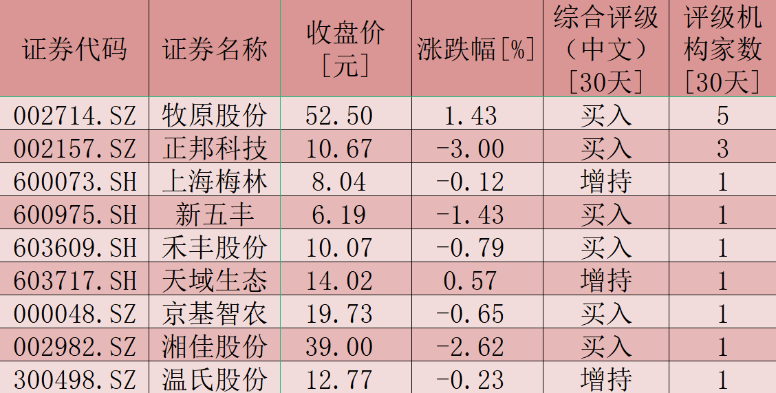 表:最近30日內,豬肉板塊獲機構給予“買入”或“增持”等看好評級個股一覽