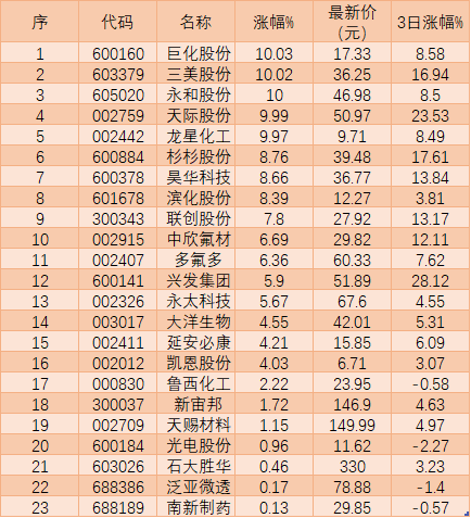 周三,氟化工板塊全線爆發,板塊收報51184.55點,漲4.13%,巨化股份、三美股份、永和股份、天際股份、龍星化工漲停,另有,杉杉股份(8.76%)、昊華科技(8.66%)、濱化股份(8.39%)、聯創股份(7.8%)、中欣氟材(6.69%)、多氟多(6.36%)、興發集團(5.9%)、永太科技(5.67%)等股漲幅超5%。
