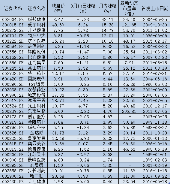在9月份以來的這波反彈中,醫美股的分化趨勢已有所體現,期間有31只醫美概念股呈現不同程度的上漲,占行業內成份股比例為60.78%,華邦健康、愛爾眼科、開能健康、物產中大、濟民醫療等個股期間累計漲幅均在10%以上。反觀出現下跌的個股,超半數最新動態市盈率在50倍以上,國際醫學、愛美客、貝泰妮、華熙生物等4只個股最新動態市盈率均高于100倍。