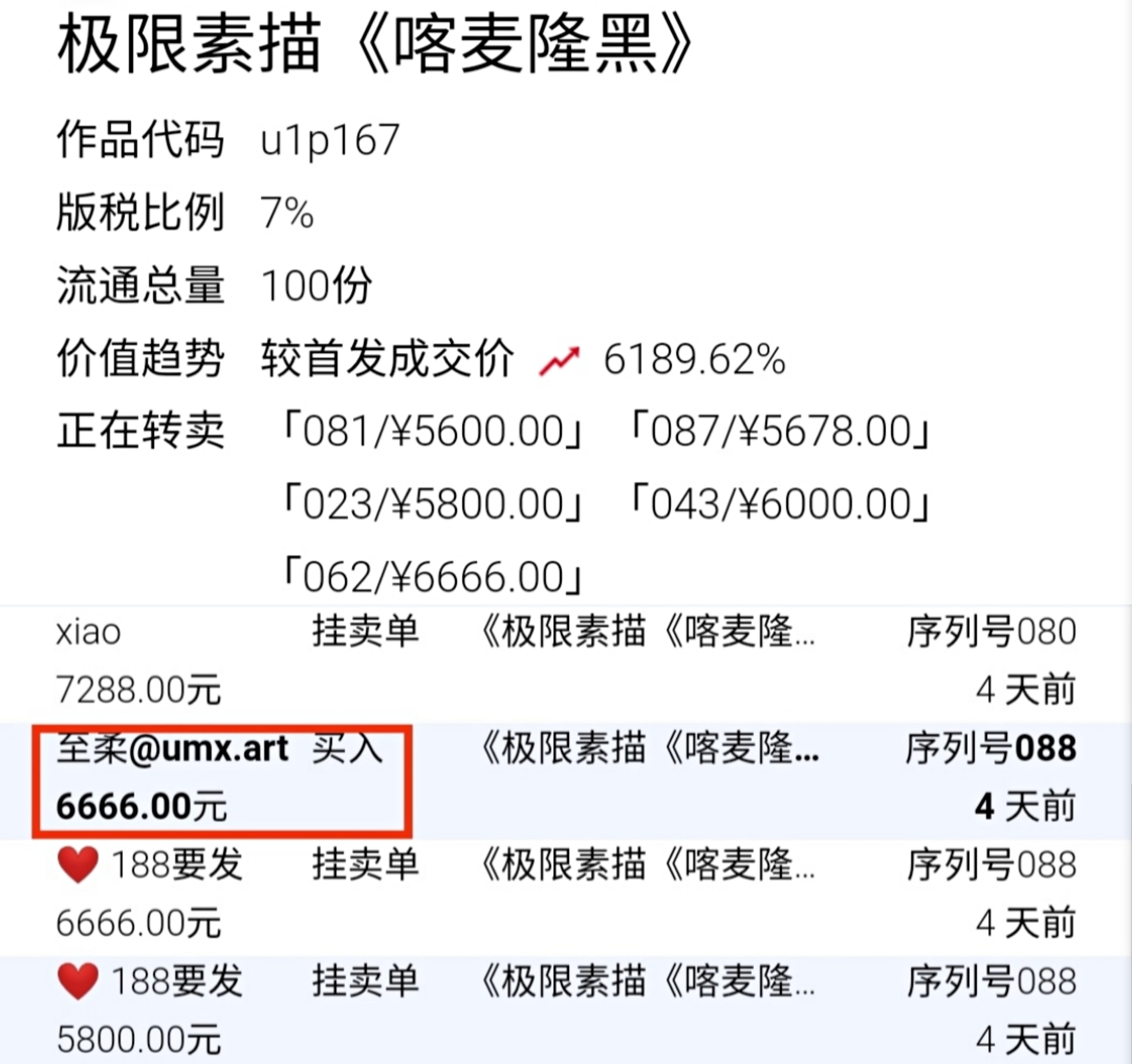 在UMX平臺二手市場,記者注意到首發價格36元發行100份的“極限素描《喀麥隆黑》”NFT商品,目前二手掛售價格已經在5000元以上,較首發成交價漲超6000%,最近一筆成交價格更是高達6666元。