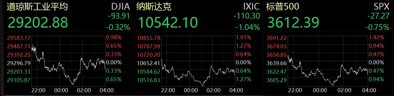 當地時間10月10日,美股市場延續下跌行情,截至收盤,美股三大指數集體收跌,為連續第四個交易日下跌,其中,道瓊斯指數跌0.32%,報29202.88點;標普500指數跌0.75%,報3612.39點;納斯達克指數跌1.04%,報10542.10點?;仡檨砜矗?個交易日,道瓊斯指數、標普500指數、納斯達克指數期間分別累計下跌3.67%、4.71%、5.68%。