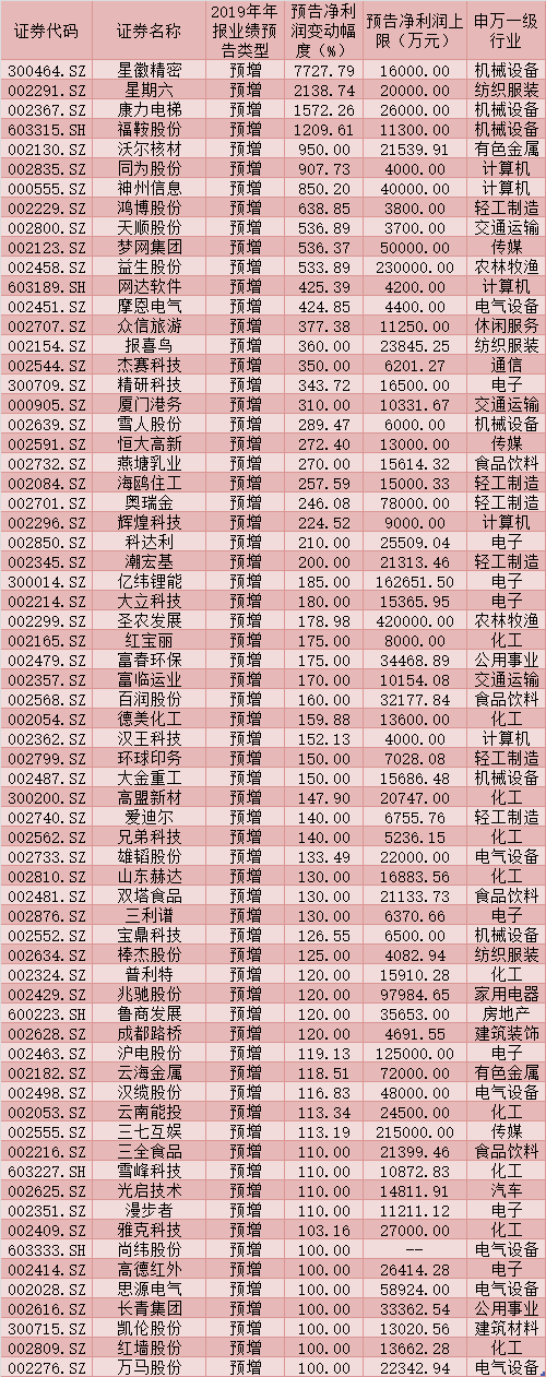 進一步統計發現,上述311家年報預喜公司中,除年報業績預計扭虧公司外,預計年報凈利潤同比增長超過100%的公司有67家,星徽精密、星期六、康力電梯、福鞍股份等4家公司均預計2019年全年凈利潤同比增長超過10倍,分別達到7727.79%、2138.74%、1572.26%、1209.61%,沃爾核材(950.00%)、同為股份(907.73%)、神州信息(850.20%)、鴻博股份(638.85%)、天順股份(536.89%)、夢網集團(536.37%)和益生股份(533.89%)等公司2019年全年凈利潤也均有望同比增長5倍以上。