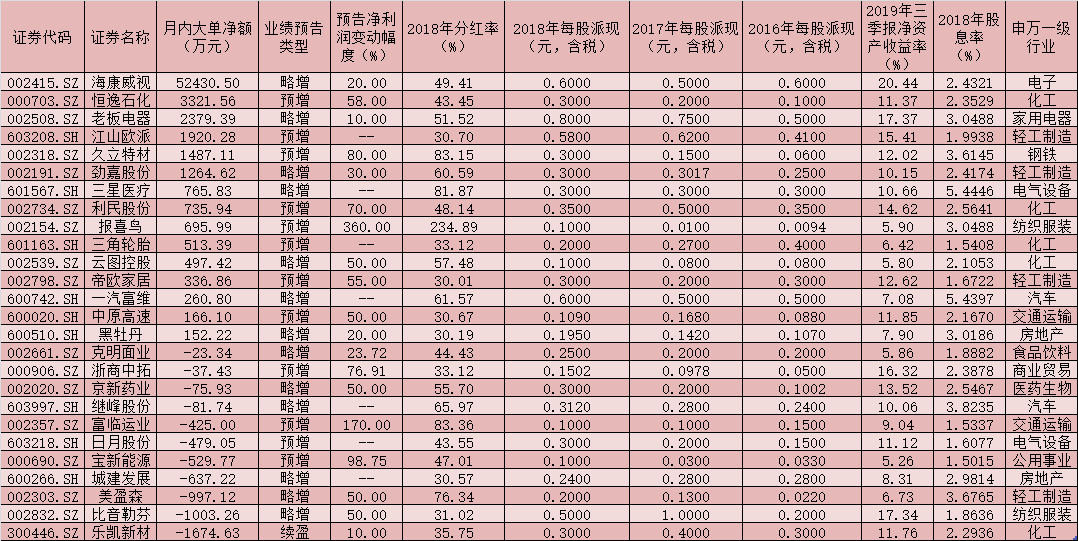 對于高分紅標的篩選,分析人士建議從現金分紅、基本面等兩大角度進行篩選,構建高股息組合。現金分紅:股息率高于1.5%、2016年以來連續分紅且2018年分紅率高于30%。基本面:2019年前三季度凈資產收益率超過5%且2019年全年業績預喜。根據上述條件進行梳理共有26只年報預喜股具有高分紅潛力,這些公司包括三星醫療、一汽富維、繼峰股份、城建發展、江山歐派、日月股份等。