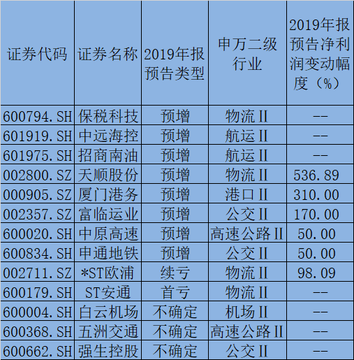 事實上,受到春節效應的影響,交通運輸產業相關公司的業績正在改善。從已披露年報預告的13家公司來看,共有8家公司2019年業績表現預喜。報告期內,天順股份(536.89%)、廈門港務(310.00%)、富臨運業(170.00%)等3家公司預計凈利潤實現同比翻番。*ST歐浦(98.09%)、中原高速(50.00%)、申通地鐵(50.00%)等3家公司年報凈利潤有望實現同比增長50%及以上。