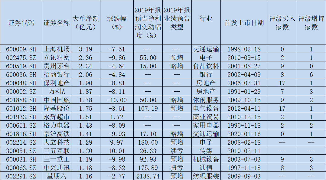 值得關注的是,仍有部分標的周一獲得大單資金的逆市流入。《證券日報》記者根據同花順數據統計發現,滬深兩市共有191只個股受到1000萬元以上大單資金青睞。其中,上海機場(3.19億元)、立訊精密(2.36億元)、貴州茅臺(2.34億元)、招商銀行(2.06億元)、保利地產(1.90億元)、萬科A(1.87億元)、中國國旅(1.78億元)、隆基股份(1.75億元)、永輝超市(1.51億元)、格力電器(1.43億元)、京滬高鐵(1.41億元)、大立科技(1.29億元)、三五互聯(1.20億元)、三一重工(1.19億元)、中興通訊(1.18億元)、星期六(1.16億元)等16只個股大單資金凈流入超過1億元,合計凈流入金額27.62億元。