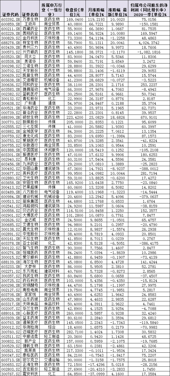 統(tǒng)計(jì)發(fā)現(xiàn),在上述225只強(qiáng)勢(shì)股中,有120只個(gè)股2020年一季度凈利潤(rùn)實(shí)現(xiàn)同比增長(zhǎng),占比逾五成。其中,新勁剛和特寶生物等2只個(gè)股一季度凈利潤(rùn)同比增幅均超10倍。