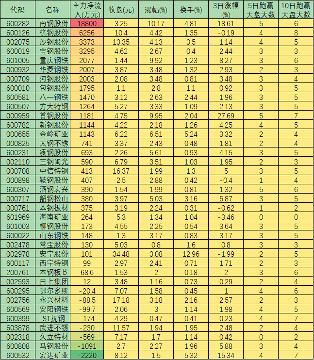 從市場表現來看,鋼鐵板塊38只交易中的成份股全線上漲,其中,南鋼股份、首鋼股份、重慶鋼鐵等3只個股均以漲停報收,另外,金嶺礦業(6.51%)、凌鋼股份(5.61%)、韶鋼松山(5.03%)等個股漲幅均超過5%。