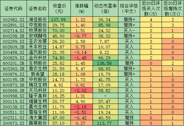 從機構(gòu)評級來看,近30日內(nèi)有20家農(nóng)林牧漁行業(yè)公司獲得評級機構(gòu)的43次推薦類評級,其中,湘佳股份獲得機構(gòu)4次買入評級和2次增持評級,此外,包括中寵股份、牧原股份、安琪酵母等在內(nèi)的7只個股獲得機構(gòu)2次以上推薦評級。