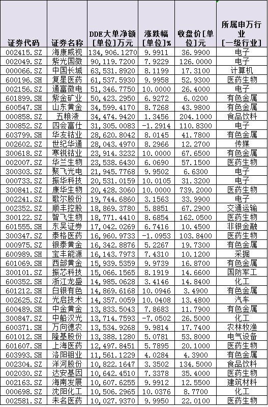 從個股來看,周一,有1290只個股呈現出資金凈流入態勢,占可交易個股總數的33.2%。其中,有345只個股資金凈流入超1000萬元,合計凈流入資金達192.57億元。??低?、紫光國微、中國長城、復星醫藥、通富微電、紫金礦業等6只個股資金凈流入均超5億元,分別為13.49億元、9.01億元、6.35億元、6.15億元、5.13億元和5.04億元。