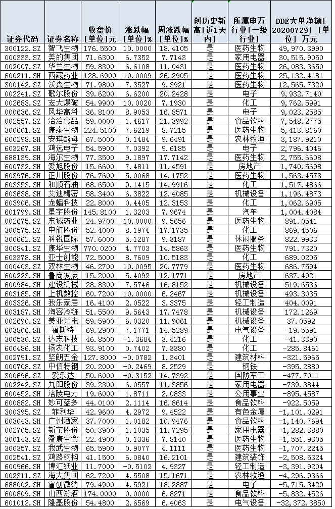 從資金流向來看,統計發現,7月29日,在上述51只個股中,有31只個股呈現大單資金凈流入狀態,占比逾六成。其中,智飛生物、美的集團、華蘭生物、西藏藥業、沃森生物