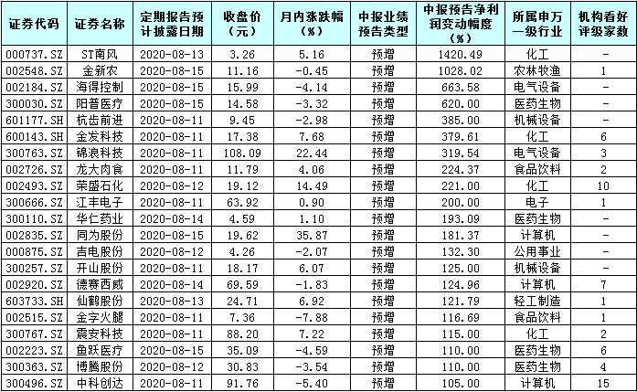 第三,逾五成個股月內實現上漲。在上述21只今年中報業績有望實現同比翻番的個股中,月內股價實現上漲的個股共有11只,占比52.38%。