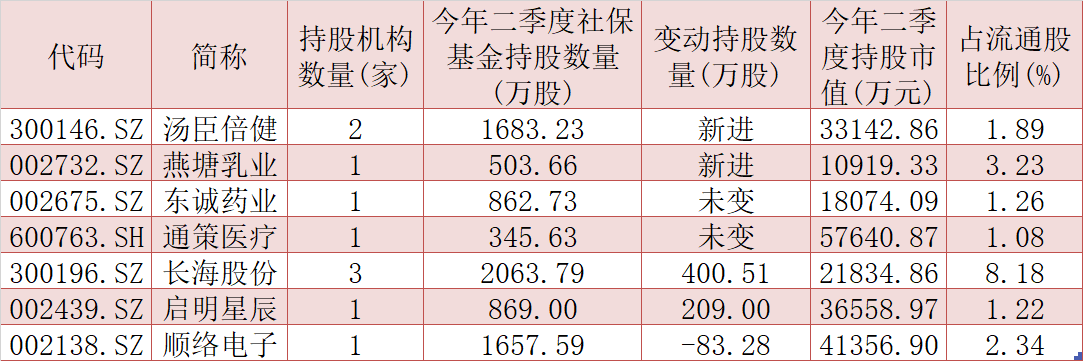 可以看到,以社?;馂榇淼拈L線資金提前布局機構調研品種。統計顯示,上述29只個股中,截至今年二季度末,共有7只個股被社保基金持倉。具體來看,湯臣倍健、燕塘乳業等2只個股成為今年二季度社?;鹦逻M品種,持股數量分別為1683.23萬股、503.66萬股;并對長海股份、啟明星辰等2只個股進行繼續加倉操作,社?;鹪龀謹盗糠謩e為400.51萬股、209萬股。對照來看,八月首周(8月3日至8月7日),上述7只個股中,共有5只個股期間股價實現上漲且跑贏大盤(滬指同期上漲1.33%),僅有湯臣倍健、順絡電子兩只股票期間股價下跌。