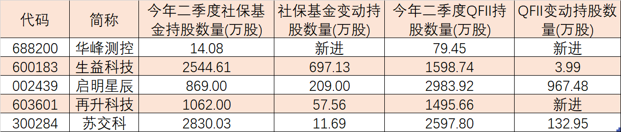 進一步統計發現,有5家公司股票成為今年二季度社保基金與QFII共同新進增持的重點品種,上述兩類機構投資風格更偏向科技類龍頭股以及行業景氣度較高的績優品種,增持資金達到11.82億元。具體來看,今年二季度社保基金以及QFII同時新進持有華峰測控93.53萬股,再升科技、啟明星辰、生益科技、蘇交科等4只個股今年二季度受上述兩類機構繼續增持操作,增持數量分別為1553.21萬股、1176.49萬股、701.12萬股和144.64萬股。
