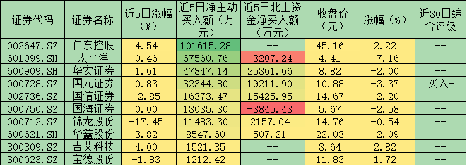 從資金流向來看,非銀金融板塊近5個交易日資金整體呈凈流出態勢,整體大單資金凈流出197.02億元,不過,仍有10只個股呈資金凈流入,其中,有包括仁東控股(101615.28萬元)、太平洋(67560.76萬元)、華安證券(47847.14萬元)等在內的7只個股資金凈流入額超1億元。